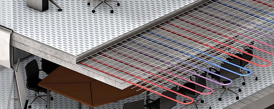 Sistemul Uponor Contec utilizeaza masa termica a structurii de beton a unei cladiri, prin instalarea tevilor care transporta apa calda si racita.