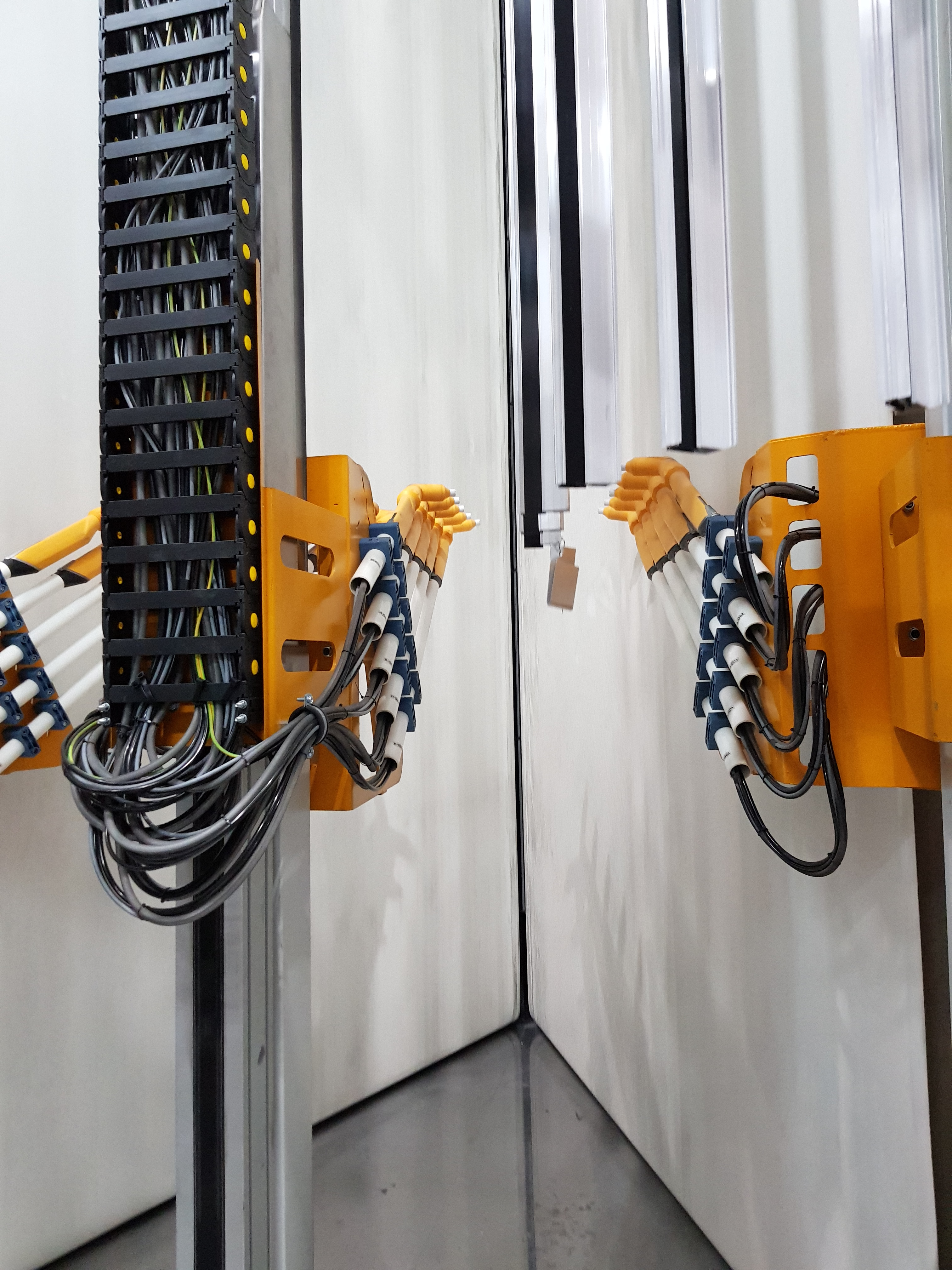 - 2 cabine in forma de V dotate cu cate 20 de pistoale de vopsire cu particule de pulbere