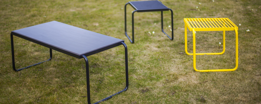 Constructia usoara din otel zincat, sezut din lamele de lemn sau tije de otel, scaunele si mesele pot fi produse din material HPL.