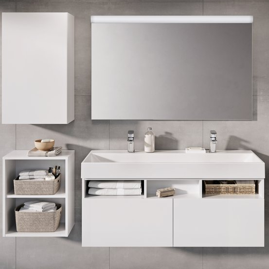 Colectia de mobilier pentru baie Step include urmatoarele produse: dulap cu oglinda MC 1000 Step, mobilier pentru chiuvete SD 1000 Step si mobilier tip coloana SB 430 Step.