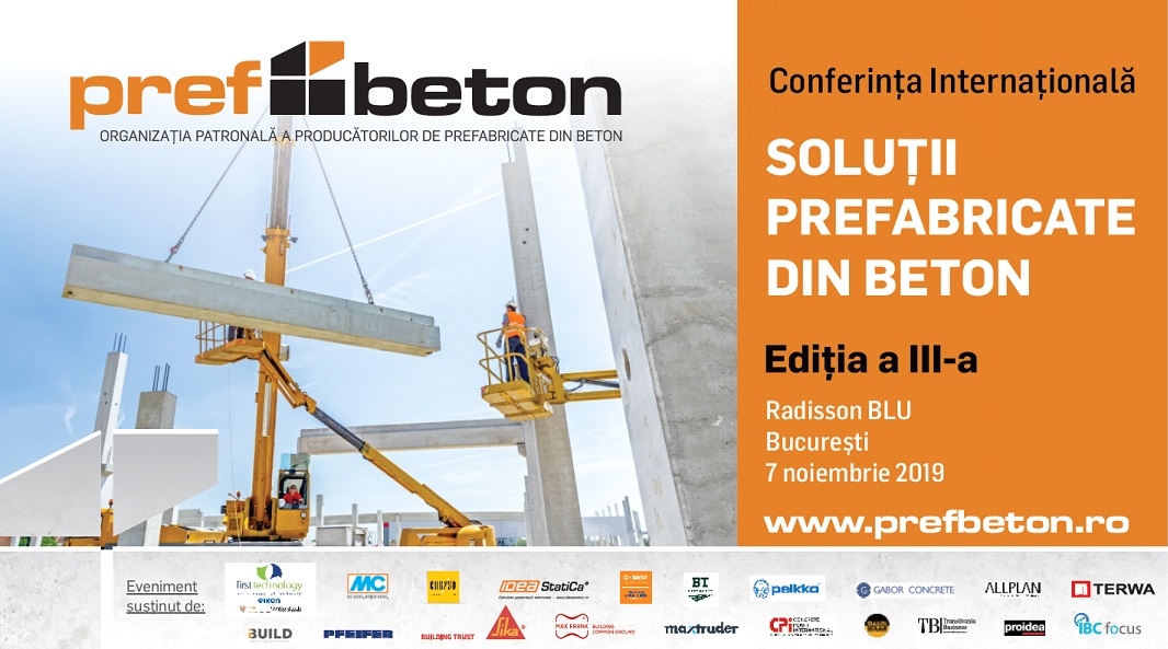 Prefbeton - Organizatia Patronala a Producatorilor de Prefabricate din Beton din Romania – organizeaza joi, 7 noiembrie 2019 a treia editie a Conferintei internationale "Solutii prefabricate din beton" la Radisson BLU din Bucuresti.