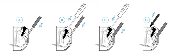 Terminalele "push-in" permit conexiunea rapida a firelor solide sau a mansoanelor prin introducerea lor simpla in terminal (A). Este posibila deschiderea terminalului pentru a extrage firul apasand prima data in jos pe buton folosind o surubelnita (C). Pentru cablu litat, este necesara mai intai deschiderea terminalului prin apasarea butonului, atat pentru extractie (C), cat si pentru insertie (B). In orice moment este posibila verificarea conexiunii prin orificiul de testare, utilizand o sonda de proba (D).