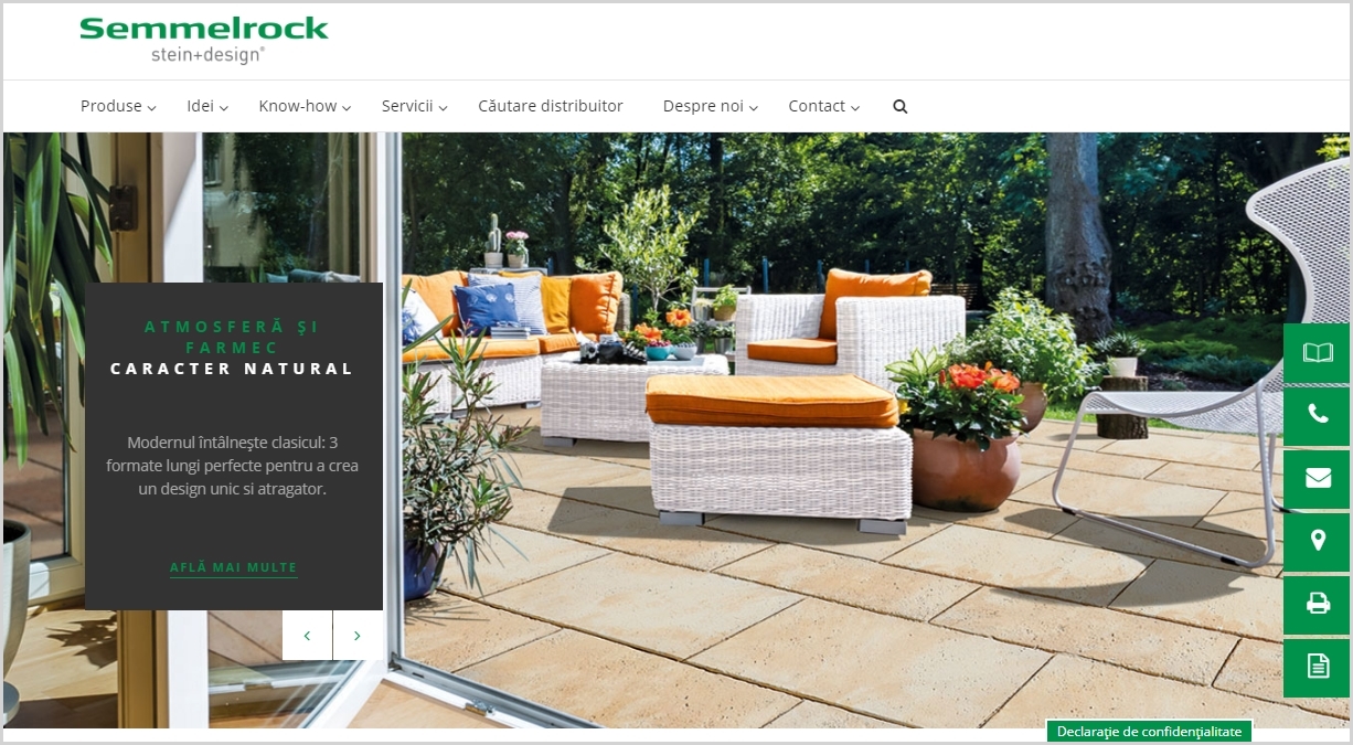 Bara de meniu ofera, de asemenea, o utilizare imbunatatita. Aceste elemente de navigare pot fi accesate direct facand clic sau tastand zonele cheie ale site-ului: descarcari (cataloage, fisele tehnice de produs, etc.), functii de contact (email / telefon), locatii Semmelrock.