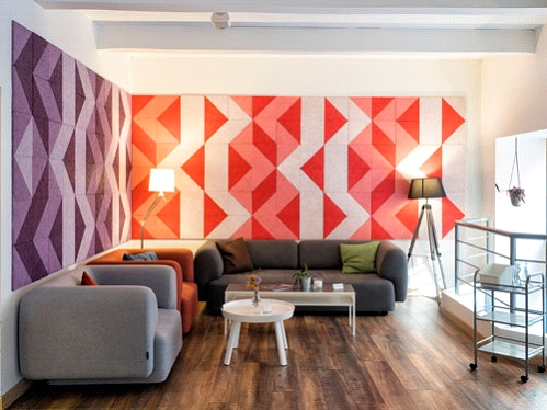 Zone de relaxare proiectate in culori: placile din fibre de lemn HERADESIGN®creative asigura functia acustica in "Share Square" din Belgrad si, totodata, ofera o atmosfera placuta de conversatie.