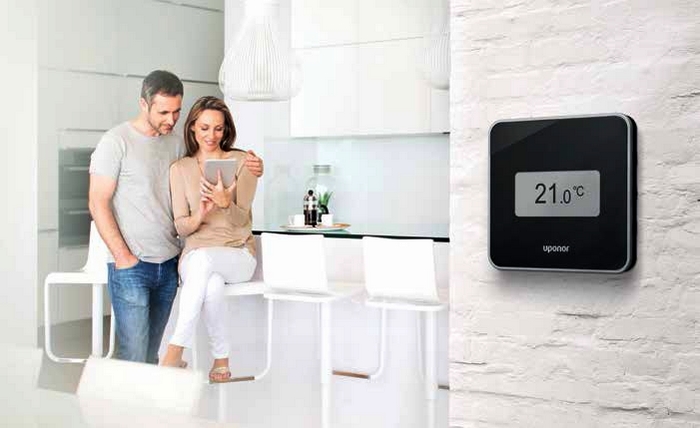 Termostatul digital este disponibil in doua variante: alb si negru. Poate fi montat pe orice perete al camerei si comunica cu sistemul de comanda Smatrix printr-o conexiune fara fir. In plus, Uponor ofera un senzor care masoara temperatura in acelasi mod. Se potriveste discret cu designul de interior, putand fi integrat aproape invizibil, asemeni unui intrerupator de iluminat din camera.