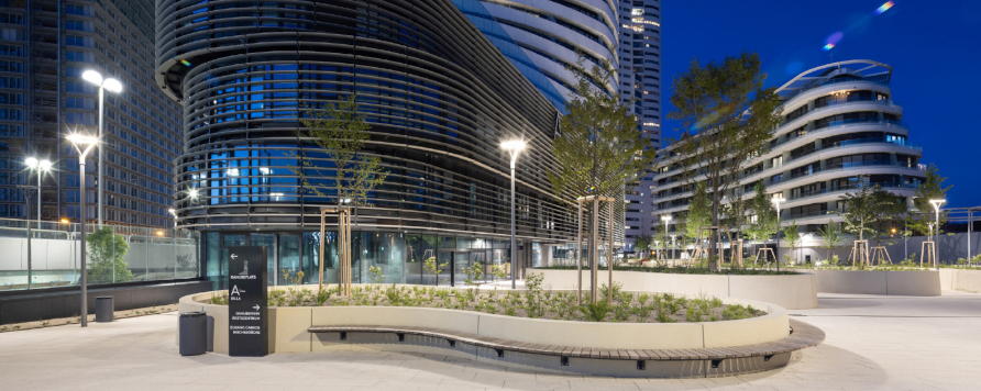 Intregul cartier Donau City, inclusiv Danubeflats, a fost proiectat ca un oras in oras. Acest lucru se reflecta atat in interior, cat si in exteriorul acestui cartier rezidential. Ofera locuitorilor servicii extinse, restaurante, facilitati wellness si sport, toate intr-un singur complex urban. Spatiul public se extinde pana la apa, unde se afla insule verzi cu plante bio-diversificate, care se leaga de parcurile din jur. Aproape 20 de banci atipice Vera Solo, care „plutesc“ pe platforme organice ridicate, fac parte din zonele de relaxare. Complexitatea proiectului se reflecta in cele 100 de ore de munca de constructie dedicate acestor banci ondulate, sustinute de picioare sau ziduri de sprijin. Spatiul public al cartierului Danubeflats a fost gandit de studiourile Karl Grimm Landschaftsarchitekten.