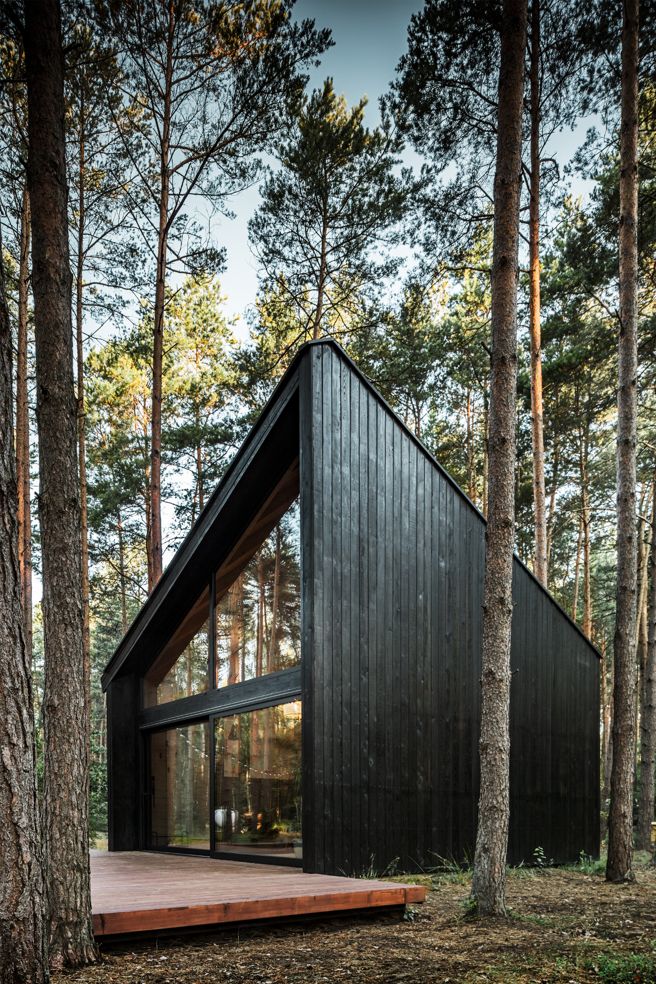The wooden structure was planned meticulously: Due to the high quality demands for surfaces and workmanship, it was manufactured by a prestigious Swiss timber construction company from first-rate glued laminated timber with 100% fitting accuracy and delivered as a kit. The finely finished white varnished interior surfaces present a strong contrast to the rustic black façade elements. For the interior design, Stramski turned to designer Jan Sekułas from Zarysy Studio in Łódź, who gave the house a mix of restraint, comfort and cosiness in the Scandinavian style.