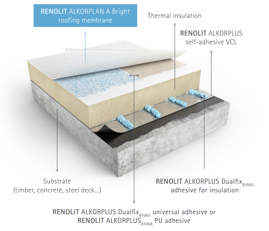 RENOLIT ALKORTEC este o membrana sintetica pentru acoperisuri, de inalta calitate, pe baza de EVA/EBA. Datorita proprietatilor sale unice, specifice produsului, RENOLIT ALKORTEC este deosebit de potrivit pentru proiectele de constructii noi si de renovare pentru care calitatea si longevitatea sunt primordiale. Beneficiile membranei: rezistent la bitum; instalare rapida si usoara; cusaturi sudate omogene; permeabil la vapori; rezistenta chimica ridicata.
