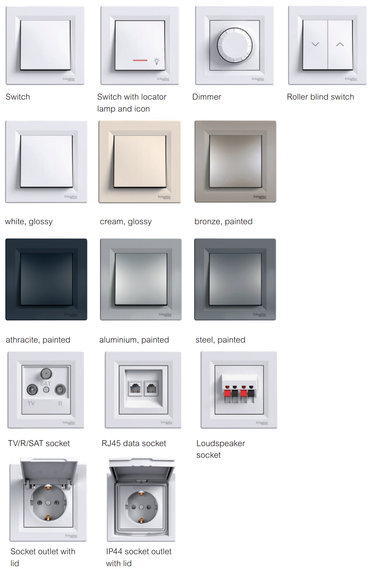 Butoane IP69 si IP69K, interfete USB si RJ45, potentiometre XB4 si XB5, indicatori luminosi LED cu 3 faze, temporizator secunde si minute, lampa de semnalizare de tip monolit XB5EV, produse Harmony wireless, buton mobil, butoane ZB4BC si ZB5AC pentru medii nefavorabile.